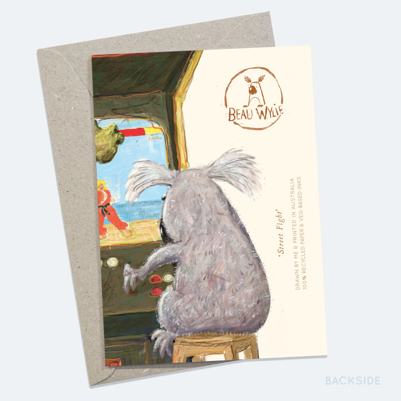 Greeting card from an original Beau Wylie Illustration. Blank inside. Standard card size (105mm x 148mm). Made in Australia from 100% recycled paper, and comes with a fully recycled kraft brown envelope, both of which are completely recyclable after use.