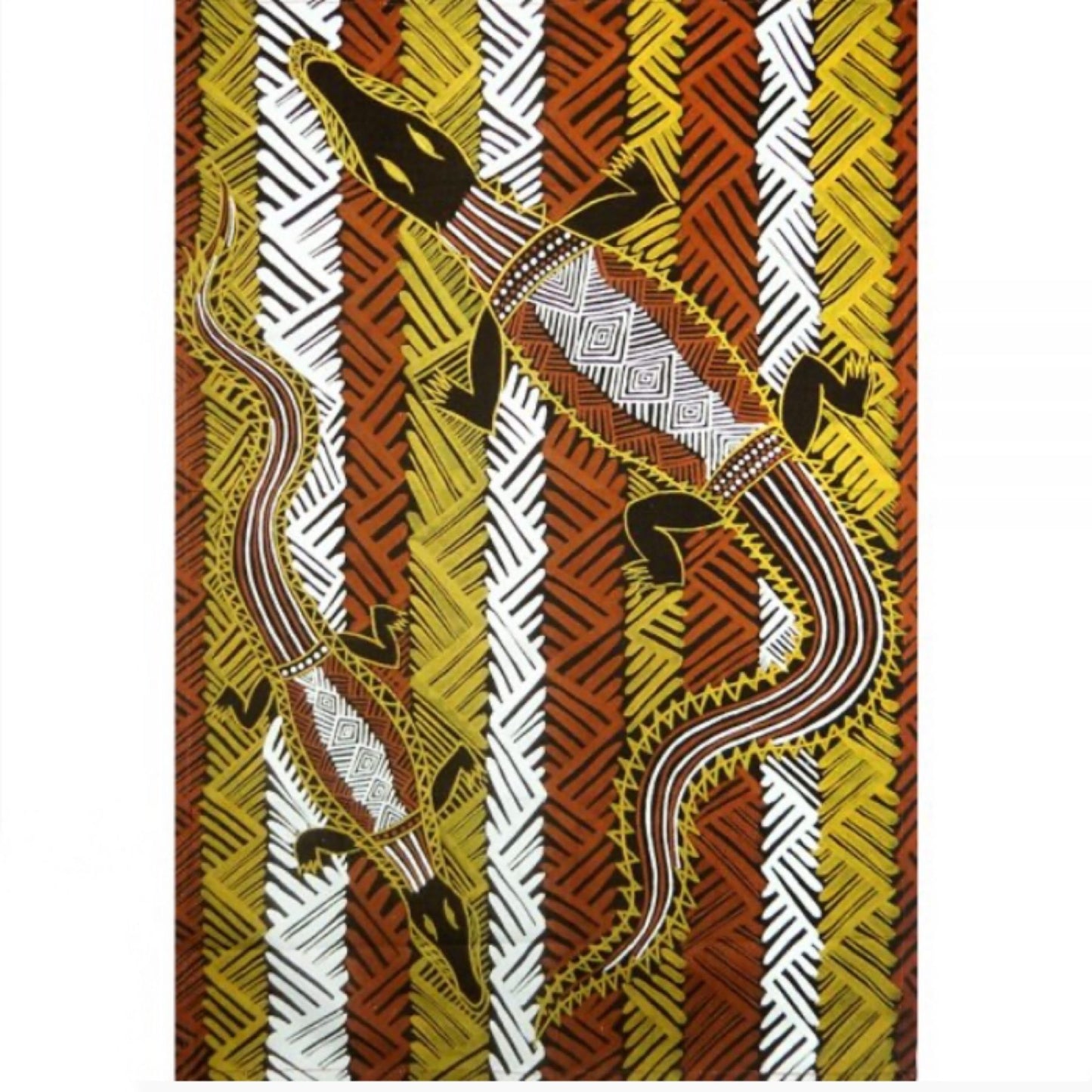 Yirrikipayi is a Tiwi term for ‘salt-water crocodile, the largest living reptile and fiercest predator in the world. The ‘Yirrikipayi’ holds great cultural significance for the Tiwi people. This design marks the ceremonial and ancestral origins of the ‘Yirrikipayi’, which had been passed down from birth.