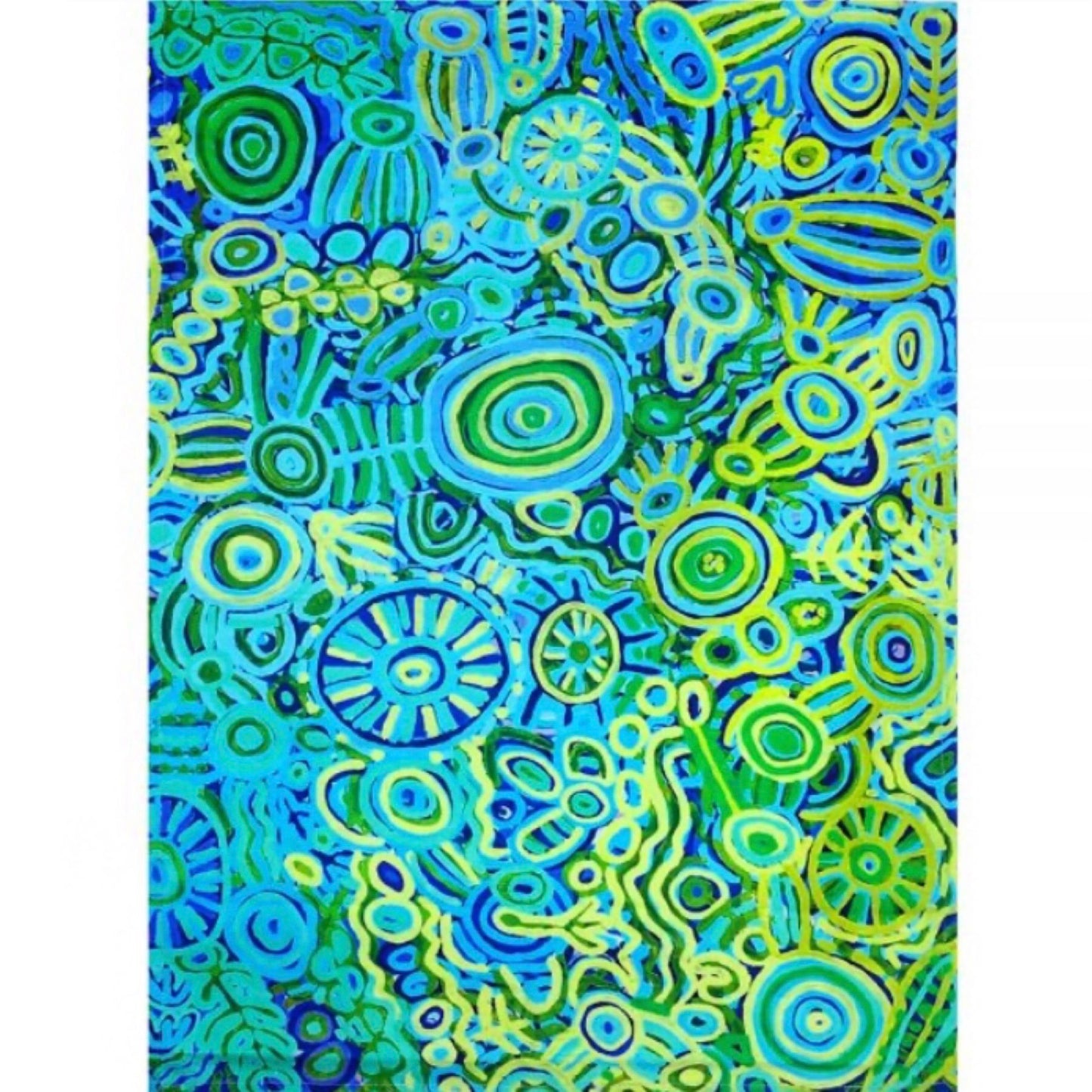 When Ngurunderi travelled through what is now Ngarrindjeri country he came down the Murray River in his canoe. At that time it was just a small stream. Ngurunderi was looking for his two wives who had run away from him and was following Pondi, the big Murray Cod who had created the twists and turns of the river when sweeping his huge tail from side to side. Ngurunderi was trying to spear Pondi all the way along the journey.Together they formed the Murray River, lakes and landforms and everything in Ngarrindjeri Country. Ngurunderi made the rain that feeds the river and the country. With the rain came the rainbow, which can be seen in this painting. Ngurunderi also made the Ngarrindjeri people, who live along and around the River Murray, lakes, the Coorong region and across to Cape Jervis and the southern regions of what is now Adelaide. Ngurunderi travelled with his family and they also played a part in the creation of Ngarrindjeri country. Ngurunderi taught everyone the lore, dance, song, how to hunt and live and everything they needed to survive in their country. When they reached Lake Alexandrina Nepele, Ngurunderi抯 brother in law, helped spear and kill Pondi. Ngurunderi cut Pondi into many pieces, each piece creating a new species of fish that now populates the river system. Ngurunderi never did catch his wives who drowned when crossing to Kangaroo Island, which was still joined to the mainland at that time. At this point Ngurunderi joined the spirit world becoming a star in the Milky Way. In July 2015 Cedric was given a grant by Arts SA. for professional development and cultural research. With the support of Better World Arts, Cedric pursued an intensive program of studying archived information at the South Australian Museum. He spent time talking to Ngarrindjeri elders and researching his Ngarrindjeri heritage in some depth. During the same time period Cedric undertook some developmental workshops focused on his painting. These workshops provided life drawing, brush techniques and colour theory components, providing tools and knowledge for Cedric to include in the technical sides of his art. The results of these inputs into Cedric抯 artistic and cultural development were immediately evident. Cedric continues to develop as an artist.