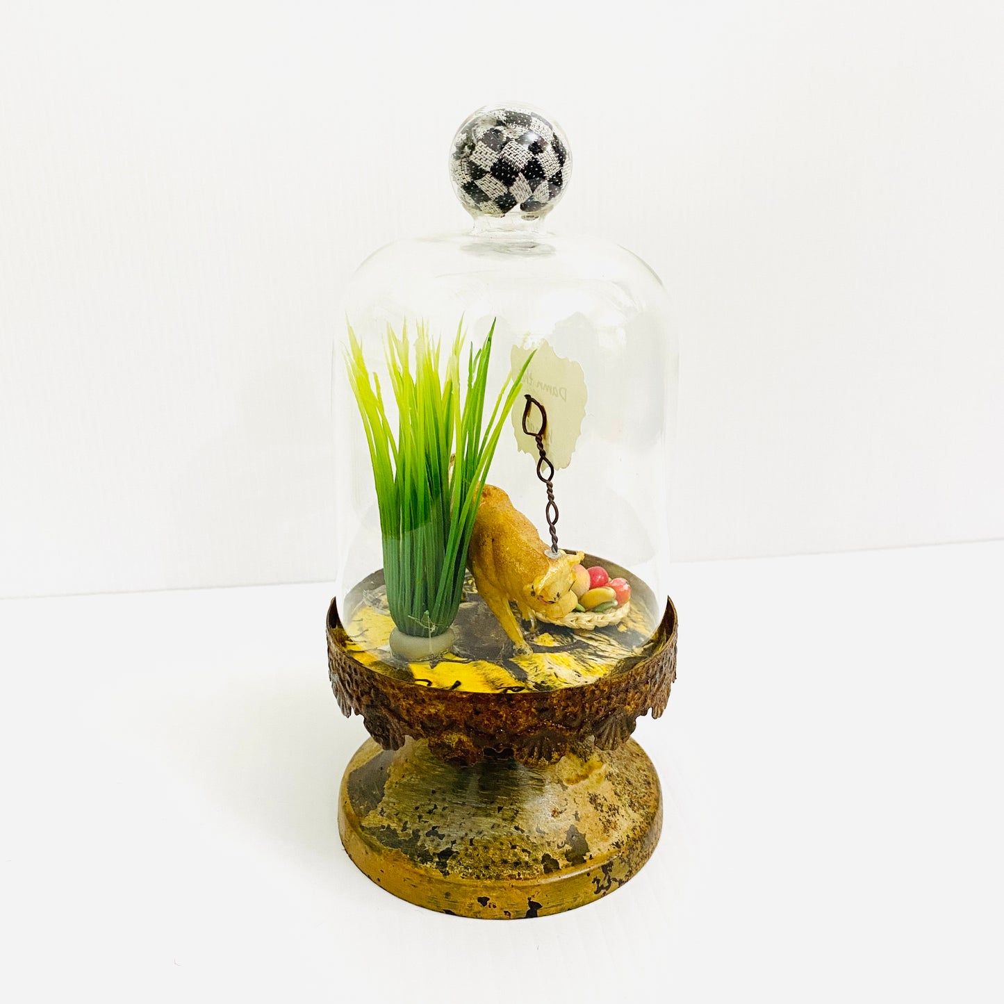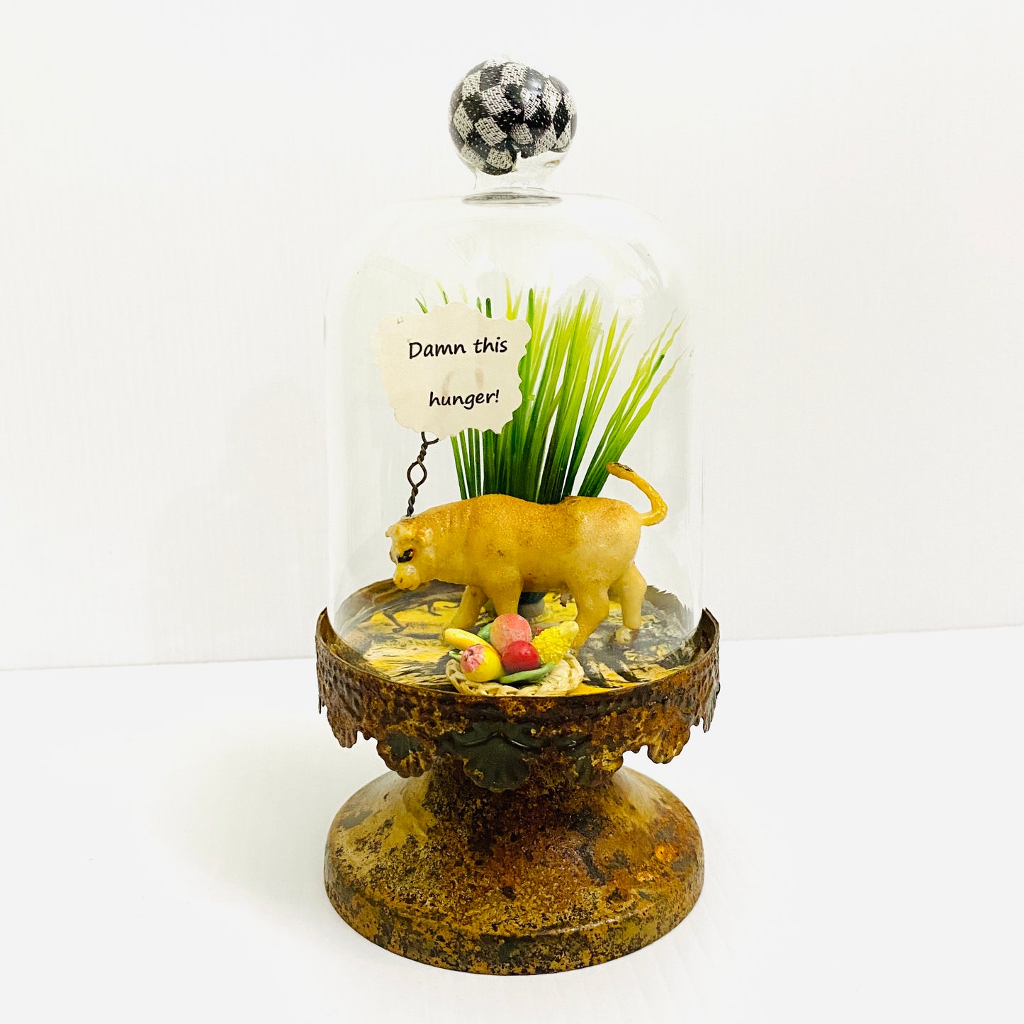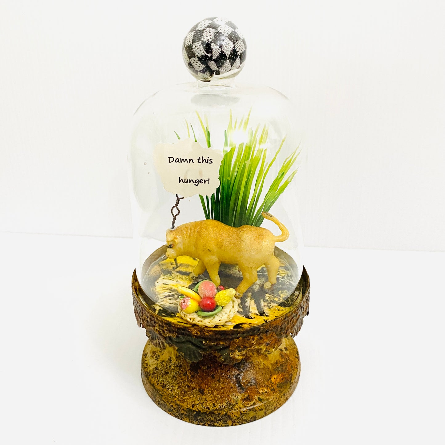 Materials: Metal base, glass, upcycled figurines, upcycled comics.