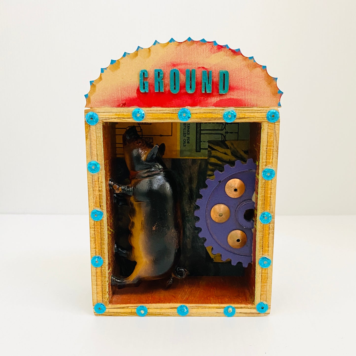 This piece is handmade by David Archer, an artist based in Adelaide, South Australia who creates fantastical and carnivalesque automata and art pieces inspired by the human condition. Each piece is one of a kind and brings a beautiful whimsy to everyday life.