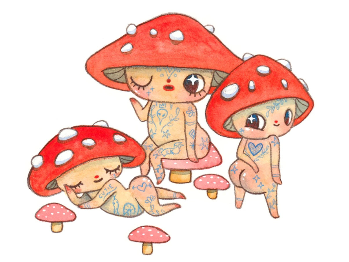 An archival quality print of watercolour and coloured pencil illustration 'Inked Caps', on acid free 320 gsm 100% cotton rag paper.