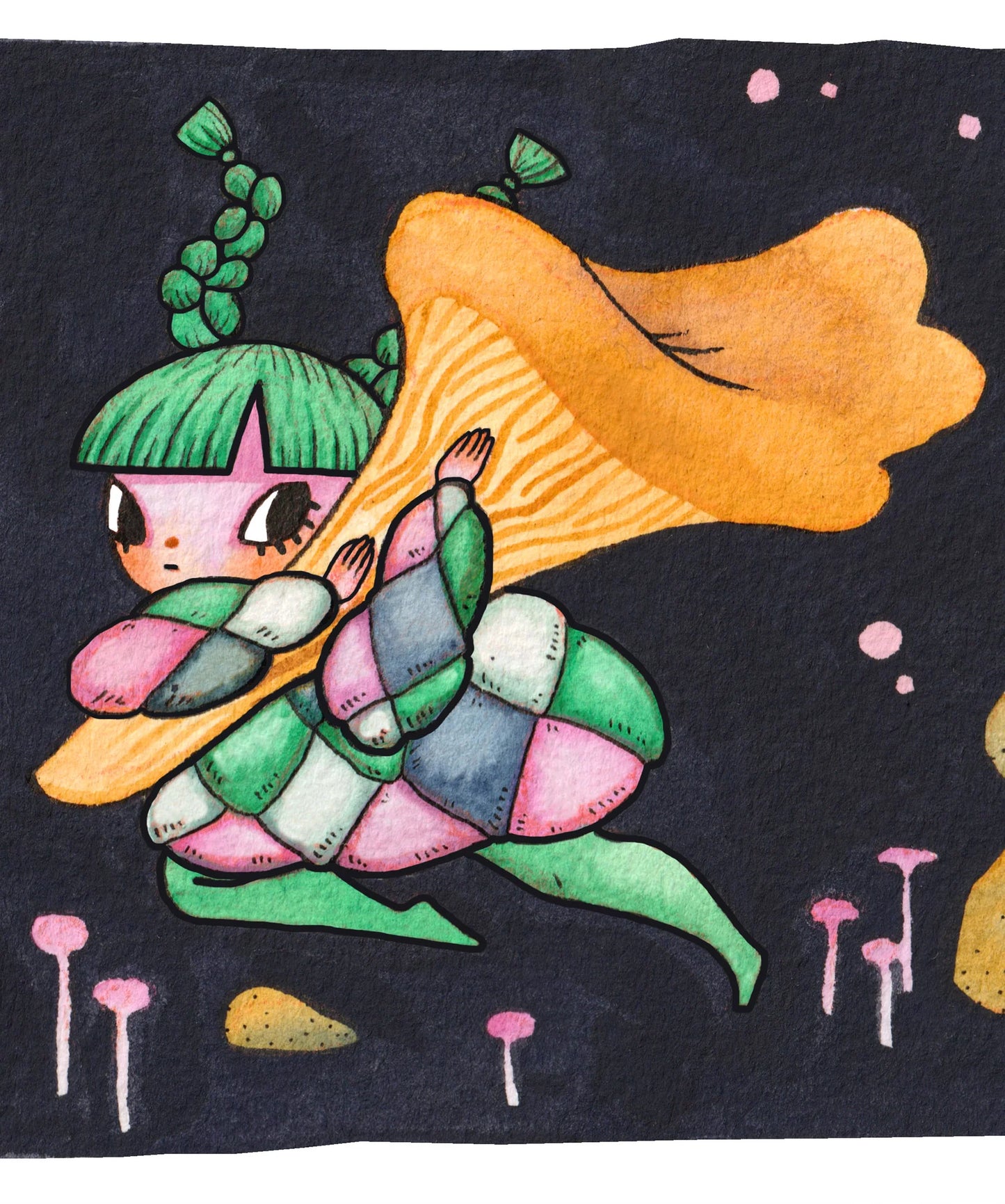 An archival quality print of gouache and ink illustration 'The Chanterelle Thief', on 320 gsm, acid free 100% cotton rag paper.