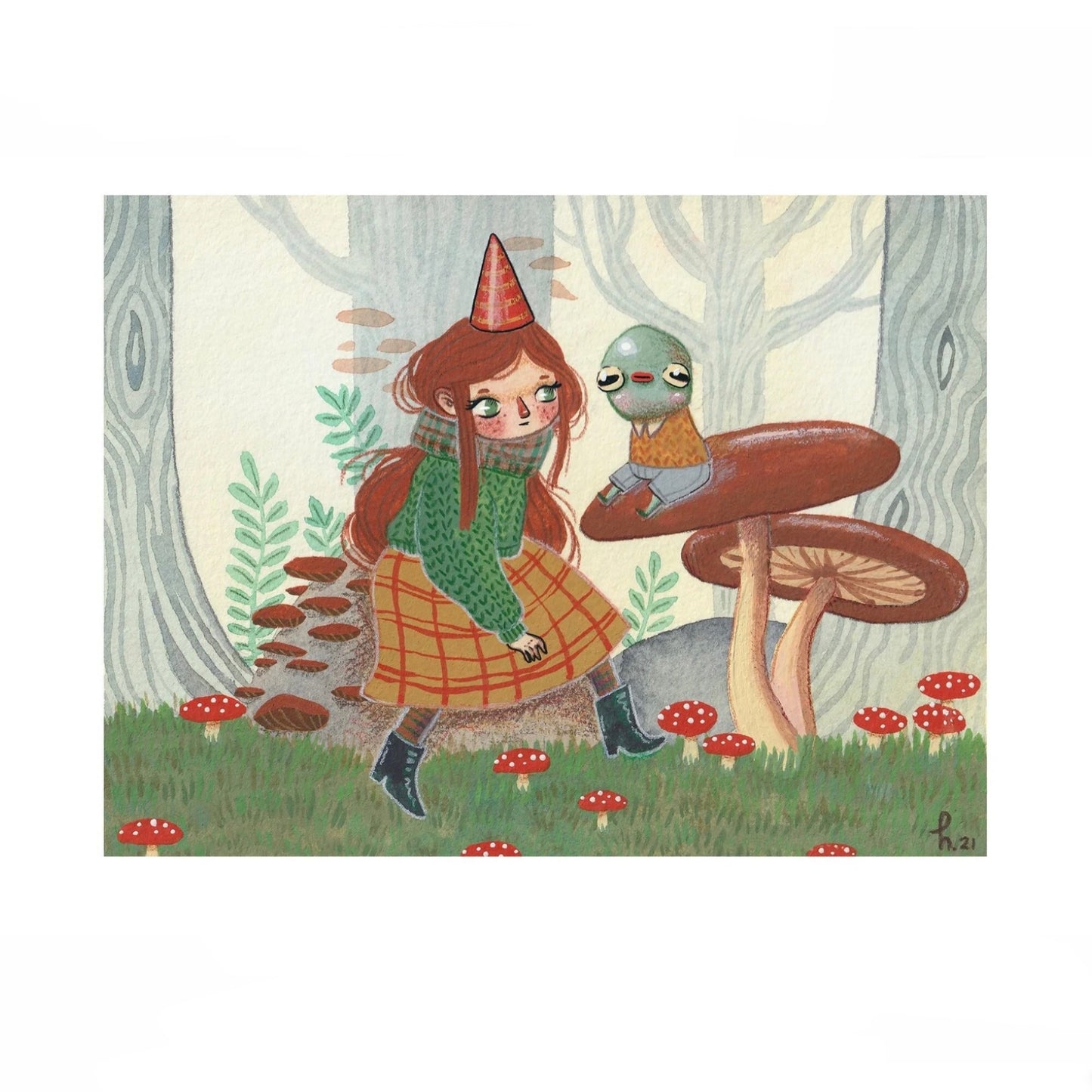 An archival quality print of Hanna's watercolour and gouache illustration 'Woodland Rendezvous', on acid free 320 gsm 100% cotton rag paper. The print size is approximately 17 x 12.7 cm with a white border (for framing). The paper size is 21 x 14.8 cm (standard A5 paper size). The print is titled and signed by Hannakin The print comes with an acid free paste board backing card, and is wrapped in clear cellophane for protection. Printed in Melbourne.