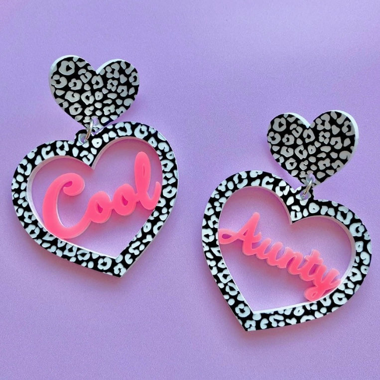 Black and white leopard pattern heart hoop with neon pink ‘Cool Aunty’