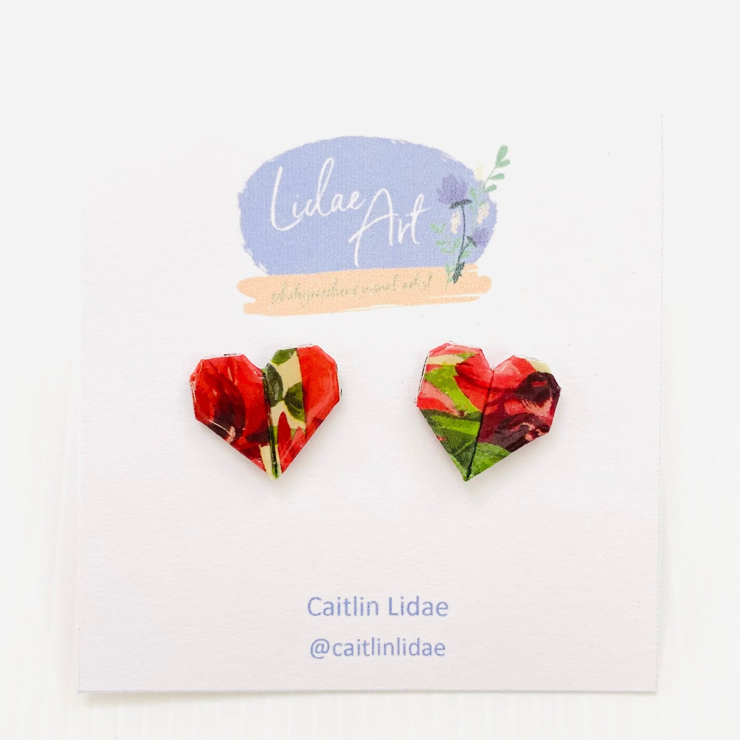 Handmade Origami Heart Earrings by Adelaide Artist Caitlin Lidae. Japanese paper, resin and surgical steel posts. Origami Heart: 15 x 20mm