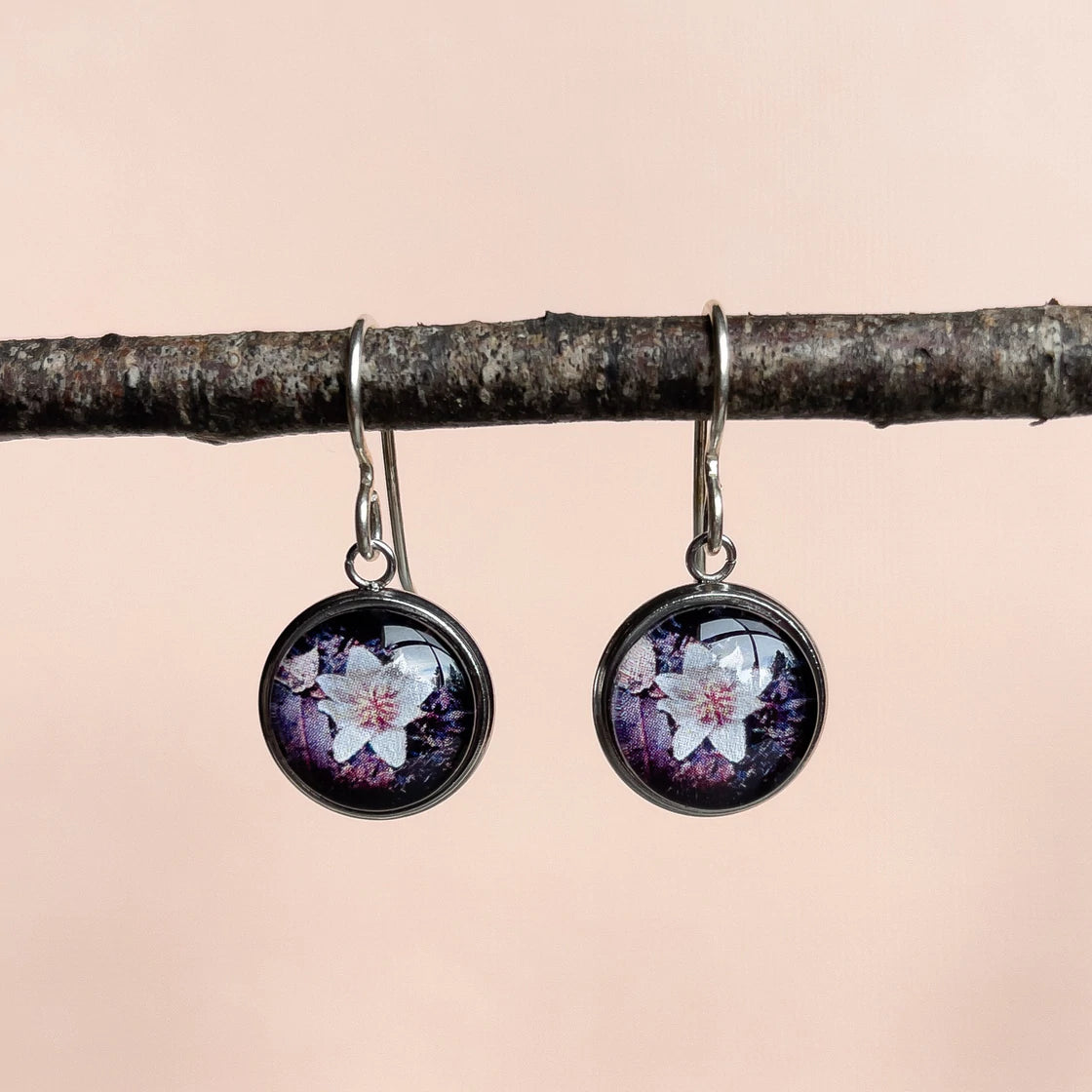 Earrings are made from glass set into stainless steel. The hooks are solid recycled silver, which are excellent for sensitive ears