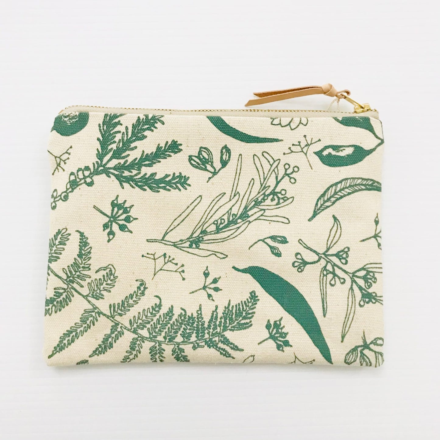 The pattern is hand drawn and screen printed with water based inks. The exterior fabric is heavy weight 100% organic cotton. The lining fabric is organic cotton. It features ykk brass zipper.