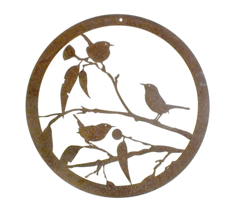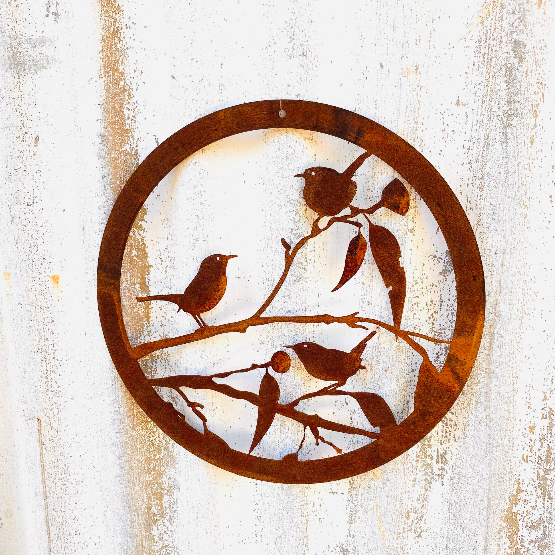 This Round Wrens Wall Art is made from mild steel which has developed a unique rust patina. This rusted surface can then be sealed to preserve the metal.