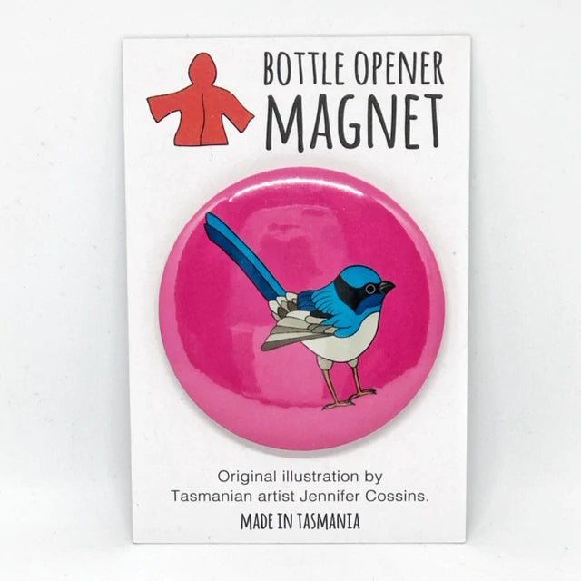 This magnet is 58mm in diameter and has a handy bottle opener on the back - never lose your bottle opener again!