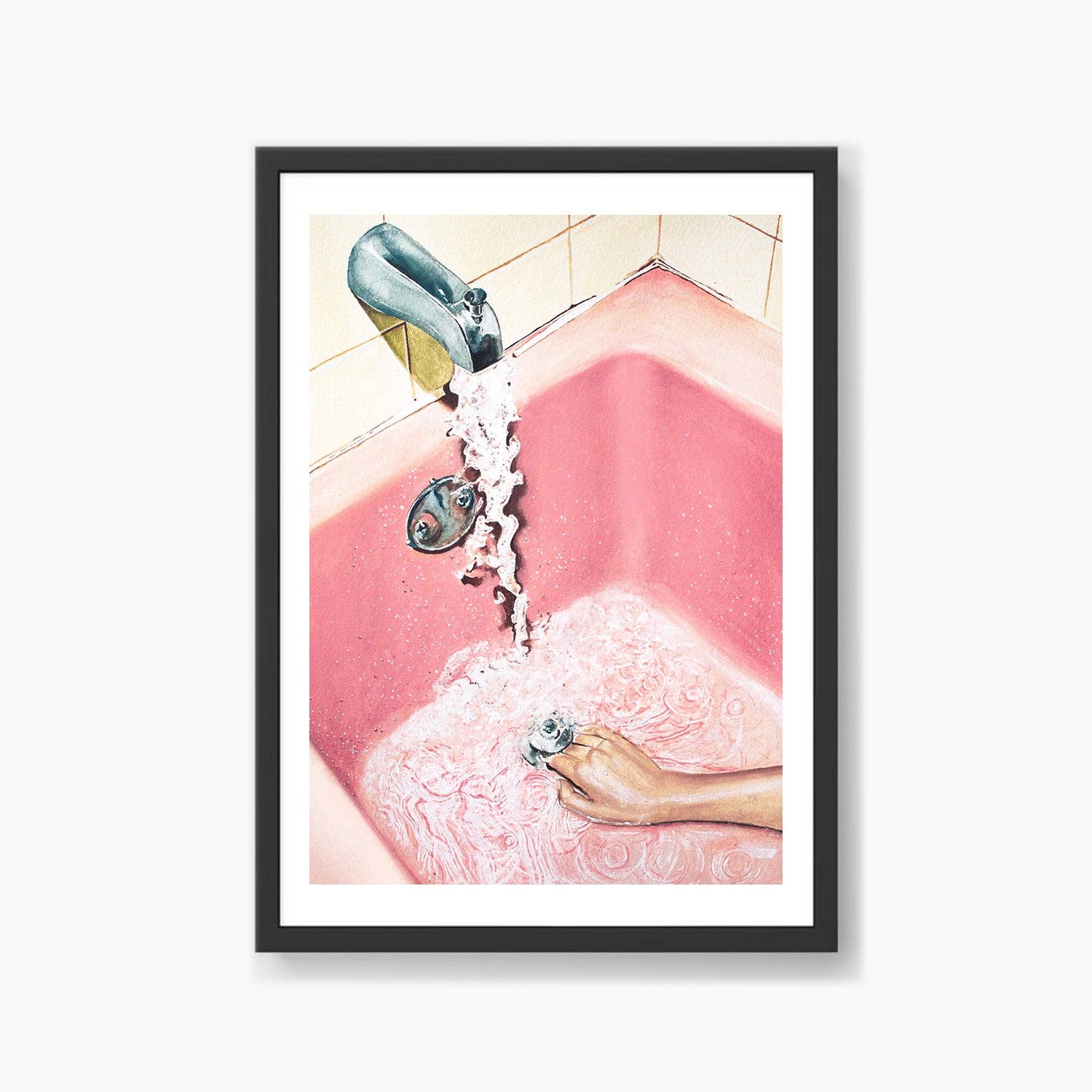 This feminine, pink bathroom print has different meanings depending on the viewer's perspective. Is it a relaxing scene in a retro 50's bath or does it contain underlying sexual symbolism? This is painted replica of an original photograph by Taylor Radelia.