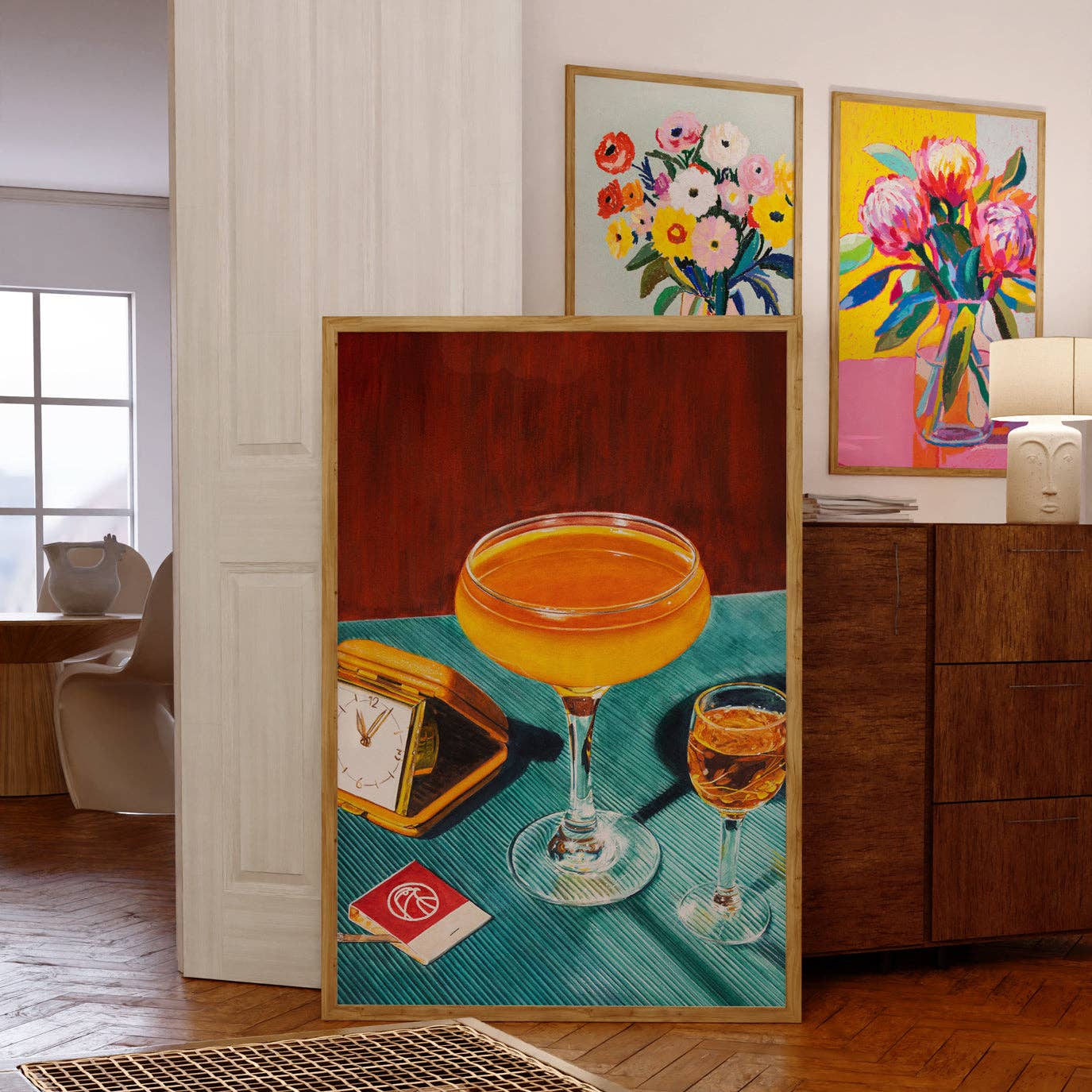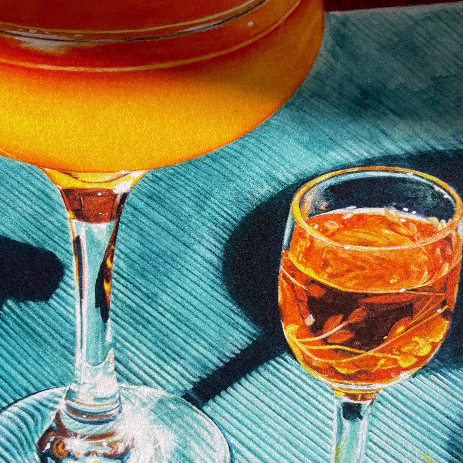Introducing 'The Temptation,' a watercolour painting that captures the nostalgia of a dimly-lit cocktail lounge! Based on an original photograph by NYC photographer Ian Loring, this artwork was created using a combination of watercolours and coloured pencils. This art print is perfect for displaying near a cocktail bar, a dining room or kitchen.