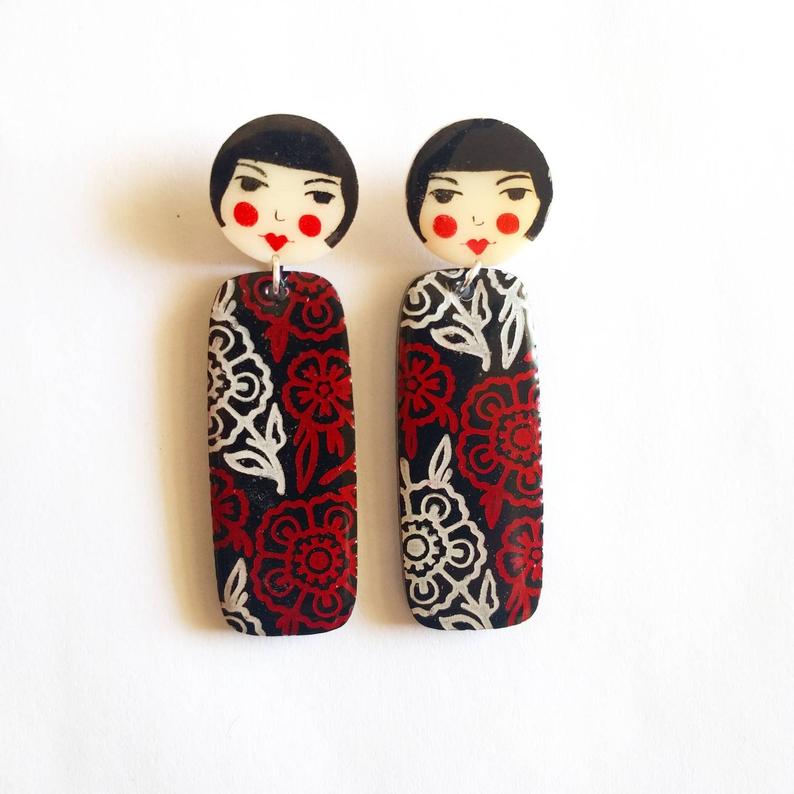 Under The Shade of a Bonsai Tree Earrings Kokeshi Red Black Floral