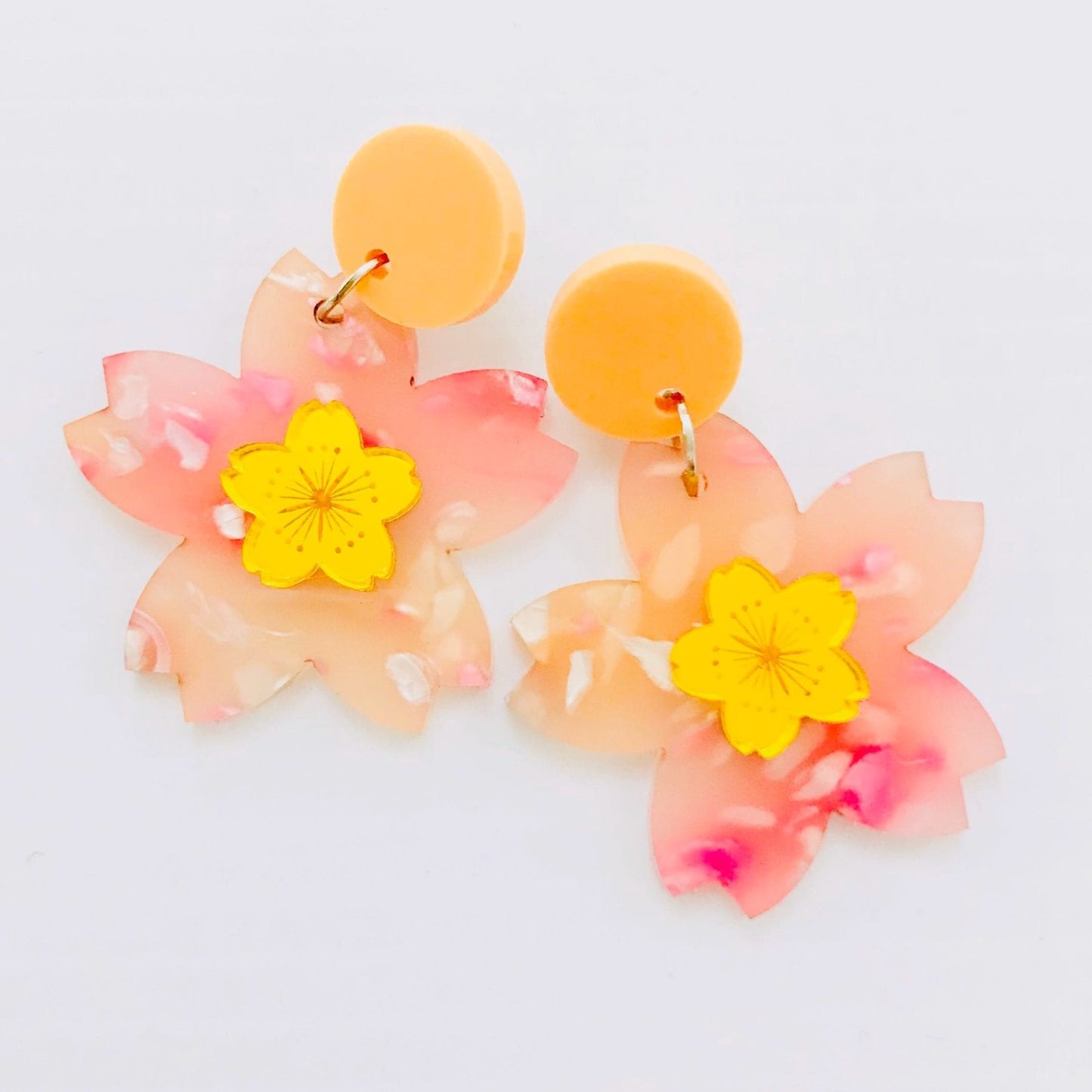 These vibrant statement earrings are laser cut from a beautiful translucent peachy pink acrylic with shimmery petal like flecks and yellow mirror. Acrylic in a cherry blossom design.
