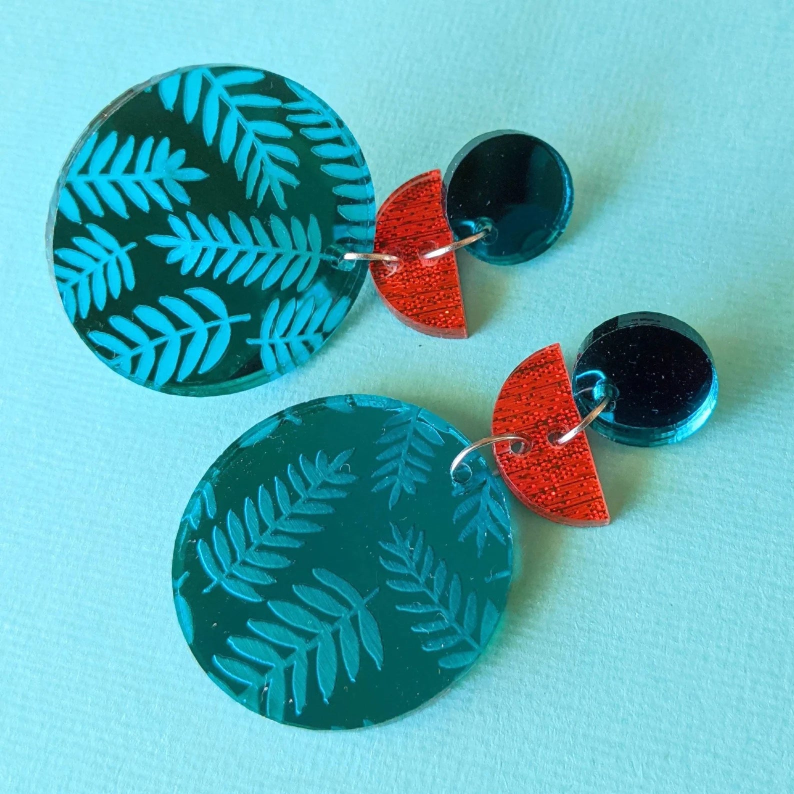 These vibrant statement earrings are laser cut from teal mirror and shimmery red fabric acrylic. It has a stunning fern design etched into the mirror which produces a beautiful reflective effect.